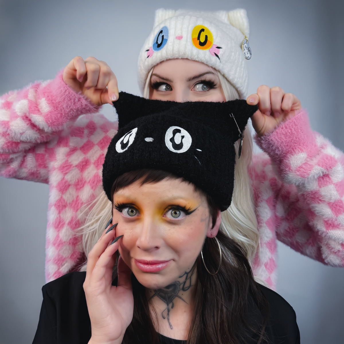 Products designed with the character's personality and history in mind. The beanies are of my original characters - Fraidy (black) and Frisky (white), where I asked the models to act like their cat counterparts.