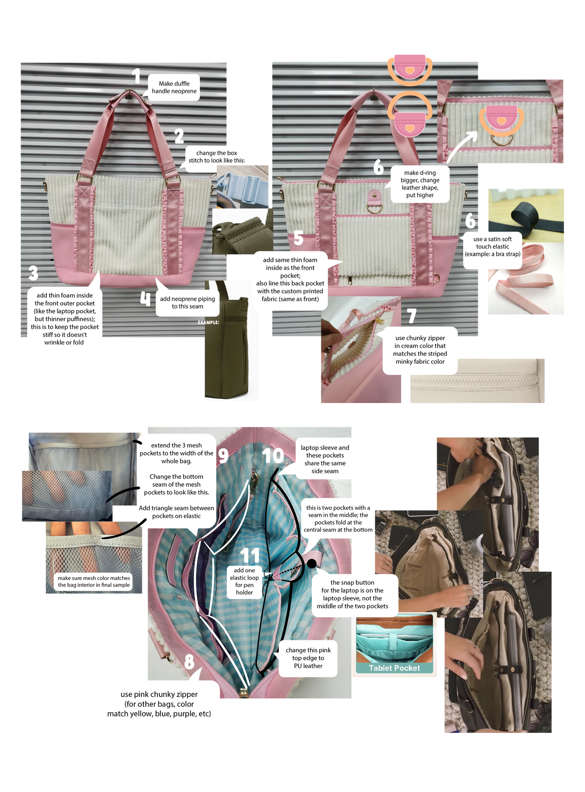 The initial mockup had a body of corduroy and nylon, which I changed to striped pinky and neoprene for ease of washing and for a more lush, sturdy structure. The new mix of materials was more luxe without increasing the cost beyond a one-time flat fee for the neoprene dye-bath (per mass production order).