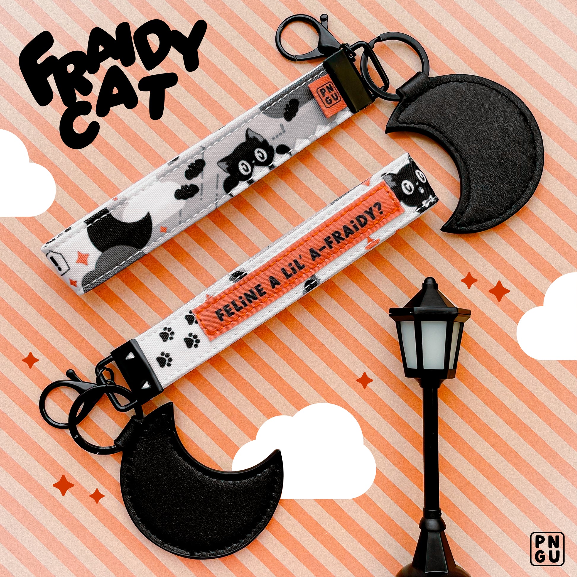 "Feline A Lil' A-Fraidy" with this original character wristlet key fob! This wristlet features Fraidy Cat, my preciously spooked kitty!