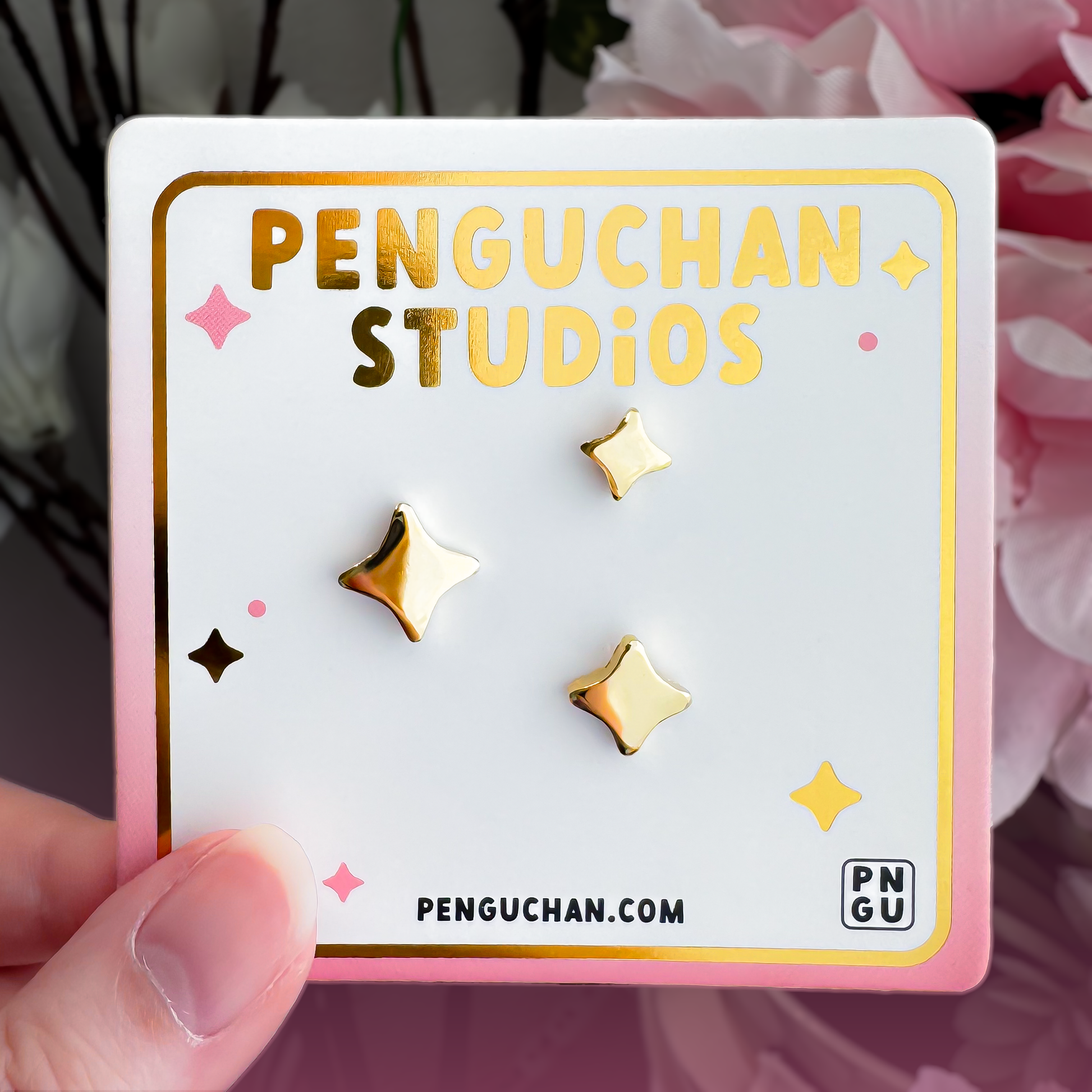 Set of three mini gold-toned sparkle pins: 8mm, 10mm, 12mm.