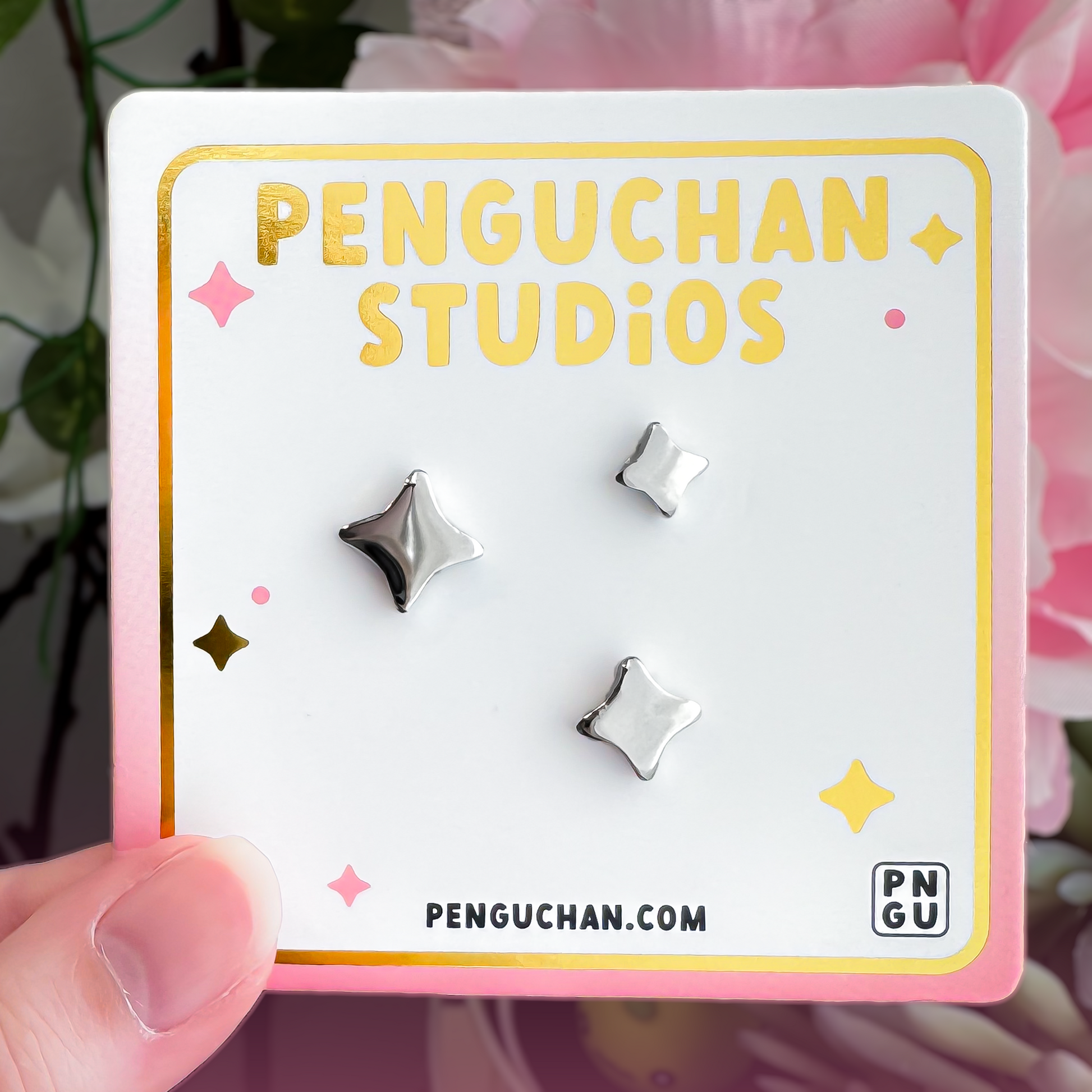 Set of three mini silver-toned nickel sparkle pins: 8mm, 10mm, 12mm.